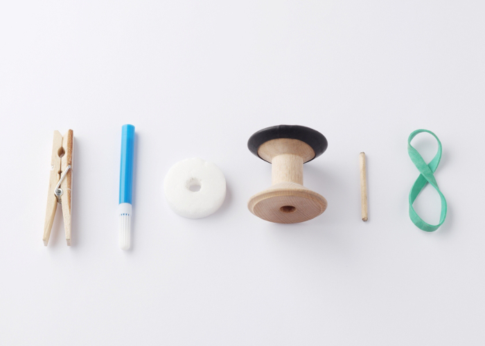 Machined Beech cotton reel, cloths peg, felt tip pen, rubber band, tyre and a small bit of wax